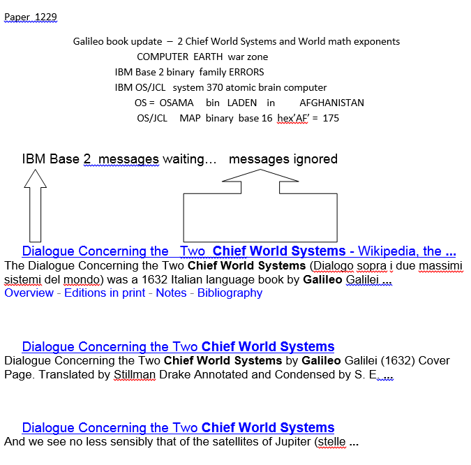 This blog post  covers Galileo book  – 2 Chief World Systems.  In addition,  we outline the   COMPUTER  EARTH  war zone,  world math exponents,  IBM Base 2 binary  family ERRORS ,  and the  IBM OS/JCL   system 370 atomic brain computer.