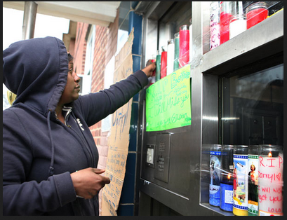 –> Merritt arranges candles in a makeshift memorial for her son Darryl