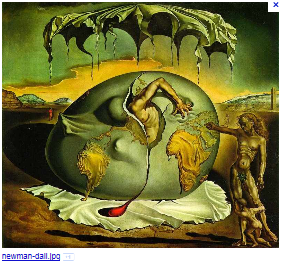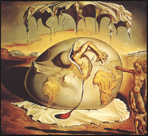 Geopoliticus Child Watching the Birth of the New Man is a 1943 painting by Salvador Dalí. The painting was done during Dalí’s stay in the United States. It depicts the large egg-shaped globe of the world out of which a man from North America is struggling to hatch. There is blood running out of the crack in the egg and the new man’s hand has England firmly in its grasp. In the foreground two figures are watching; one an adult the other a small child